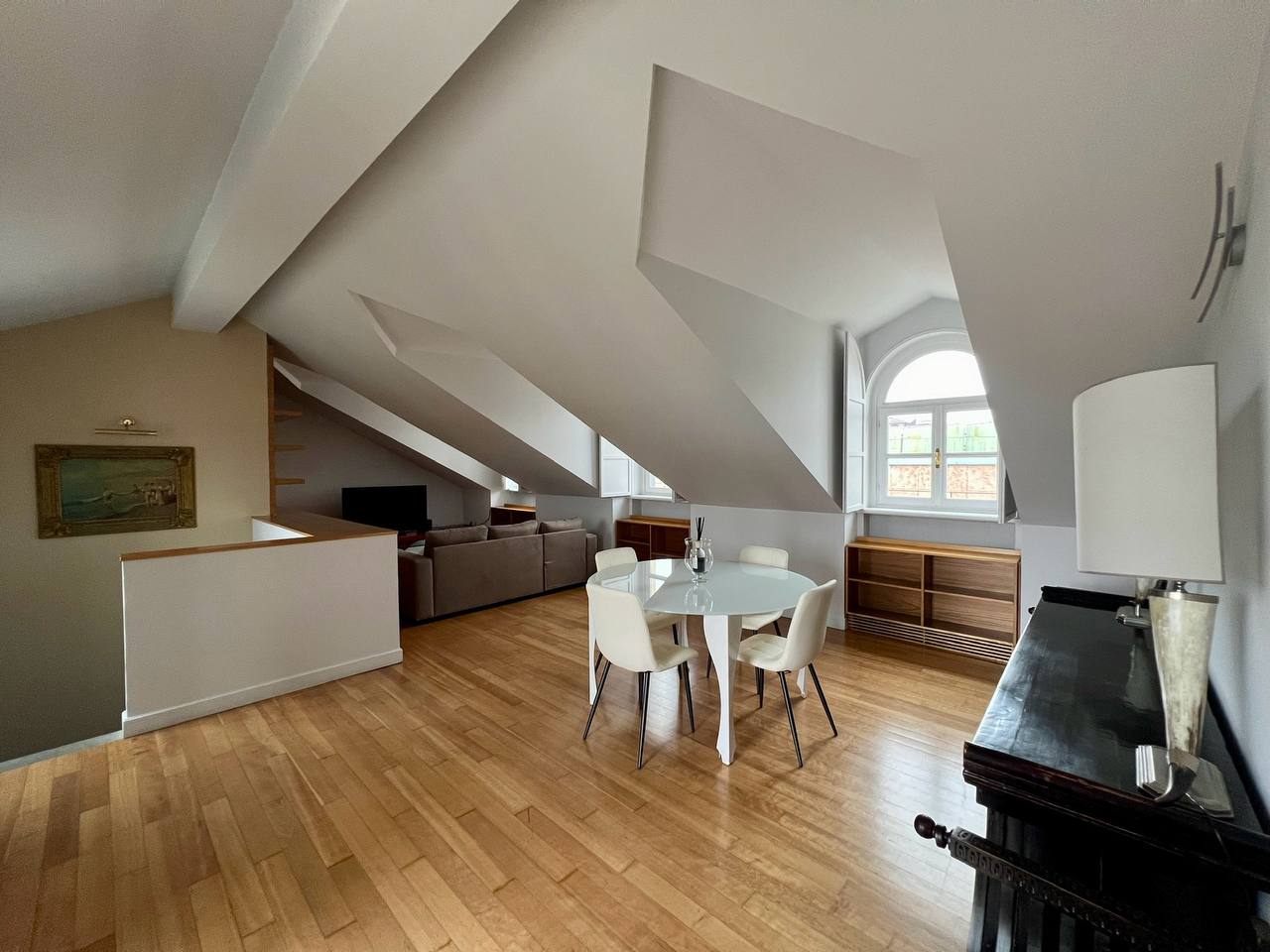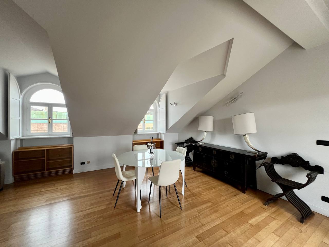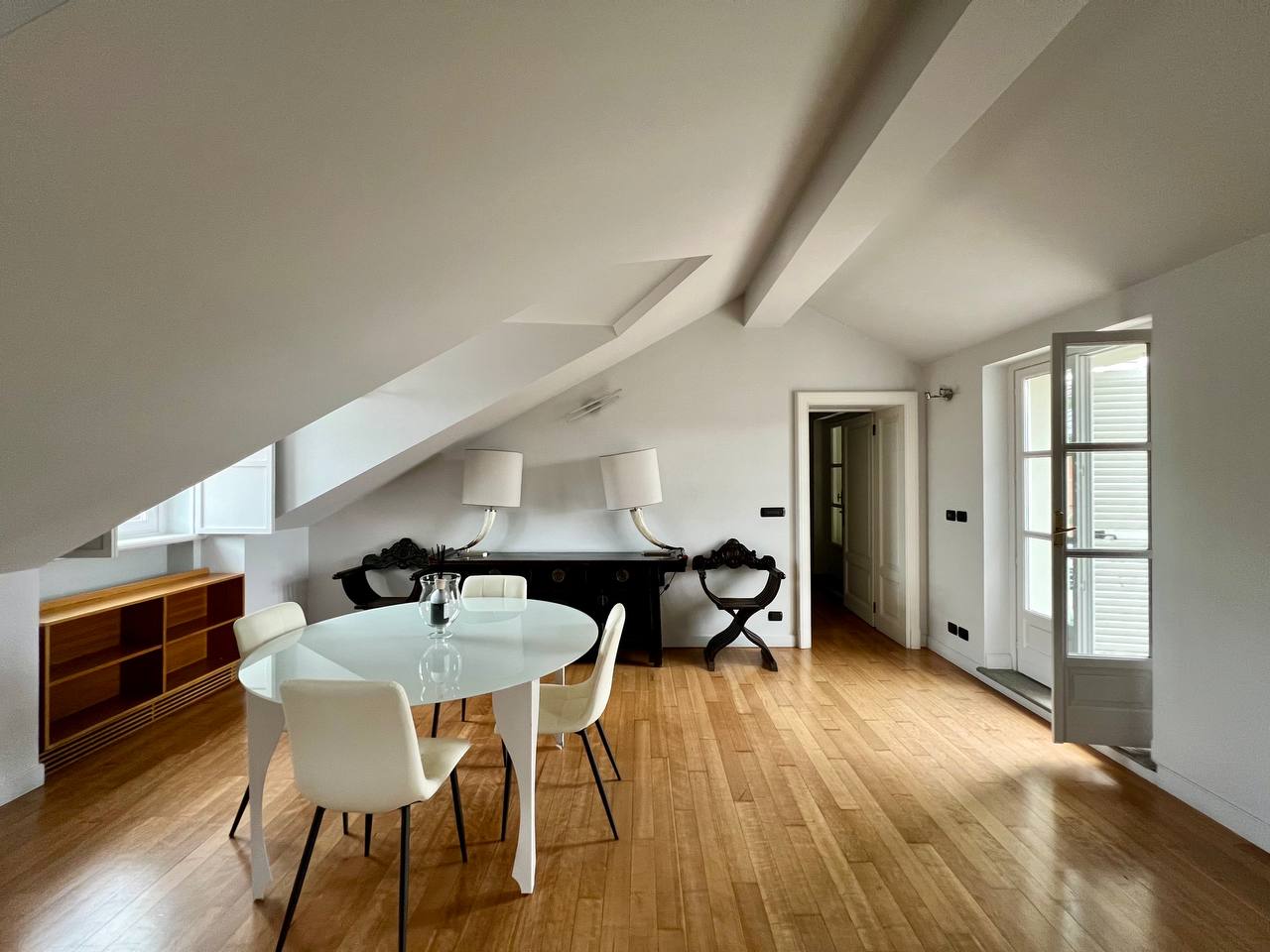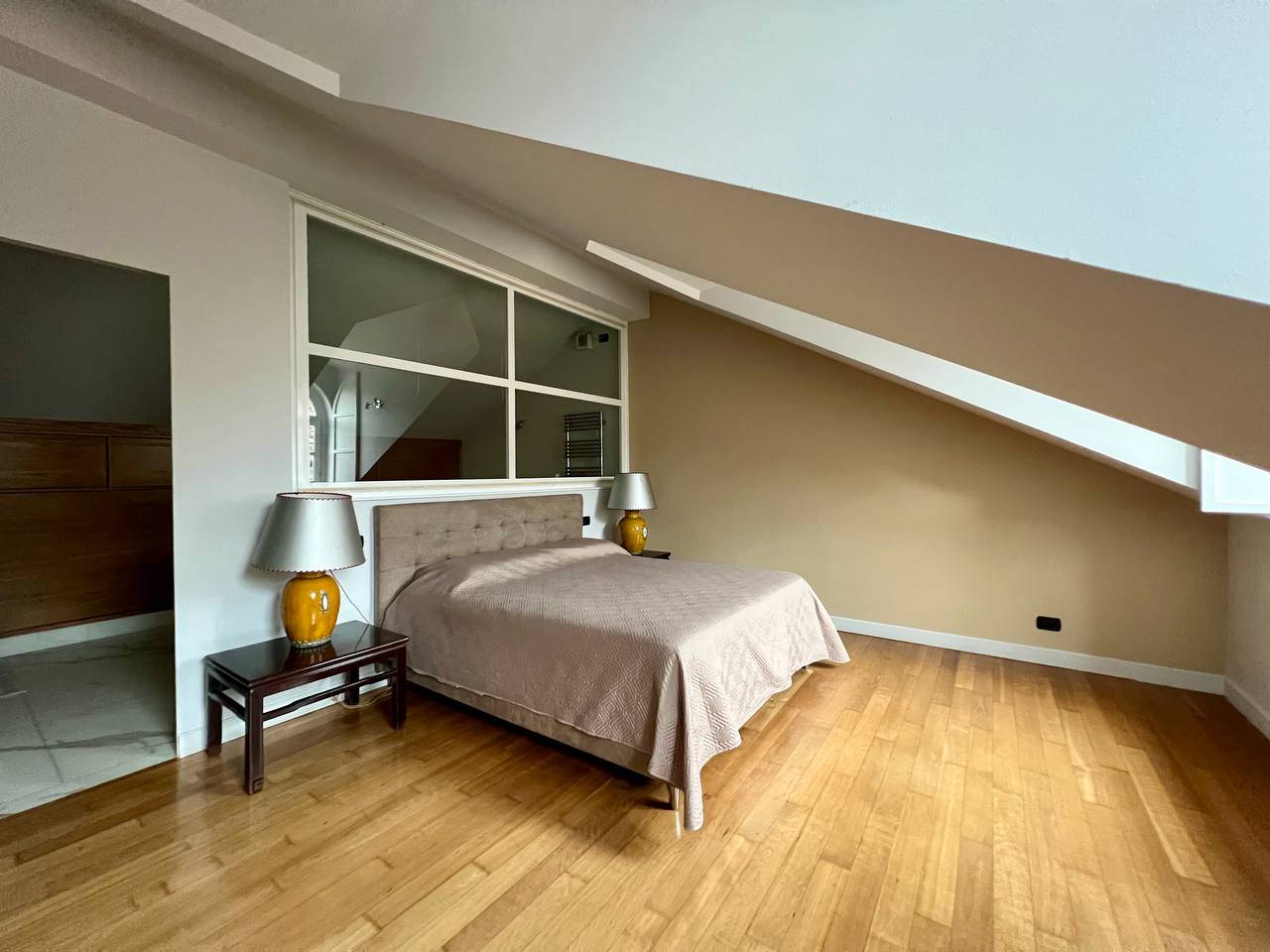 Appartamento sito all'ultimo piano di uno stabile signorile perfettamente curato nelle zone comuni, composto di ingresso su soggiorno living, cucina abitabile e attrezzata, due camere, due bagni e cabina armadio, oltre ad ampia terrazza che si affaccia sul tranquillo cortile interno. L'alloggio si trova all'ultimo piano mansardato ed è raggiungibile tramite ascensore e una breve rampa di scale da fare a piedi. L'alloggio viene affittato arredato e dispone di numerose armadiature a muro, sia nelle camere che nei disimpegni. Aria condizionata e riscaldamento autonomo. Doppia esposizione est-ovest e piano alto rendono l'alloggio particolarmente luminoso. Servizio di portineria intera giornata. Zona centralissima. Canone mensile pari a 3.000,00 euro + 180,00 euro al mese di spese condominiali. Disponibilità di due box auto singoli nello stabile aggiungendo 200,00 euro al mese per ciascuno.
