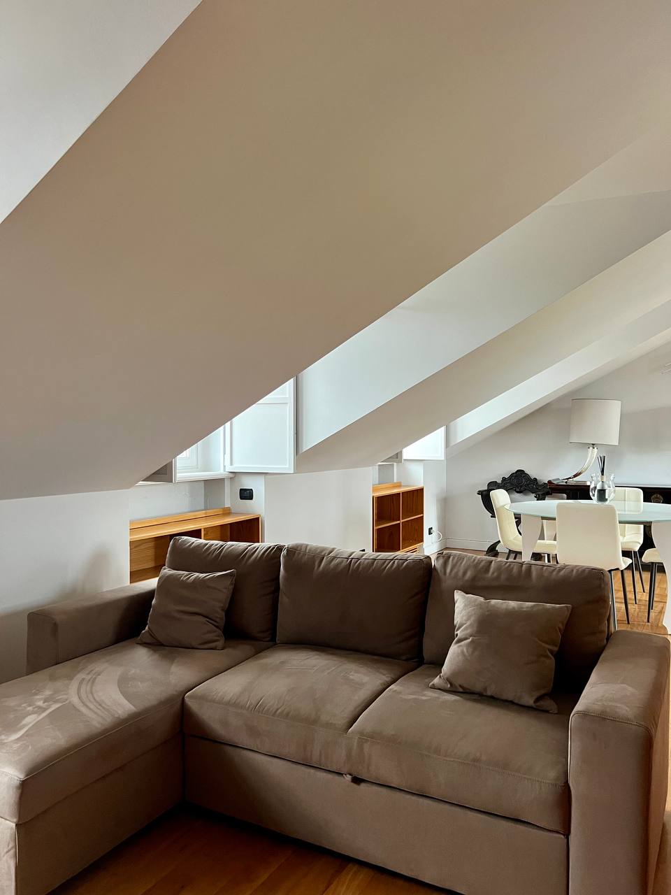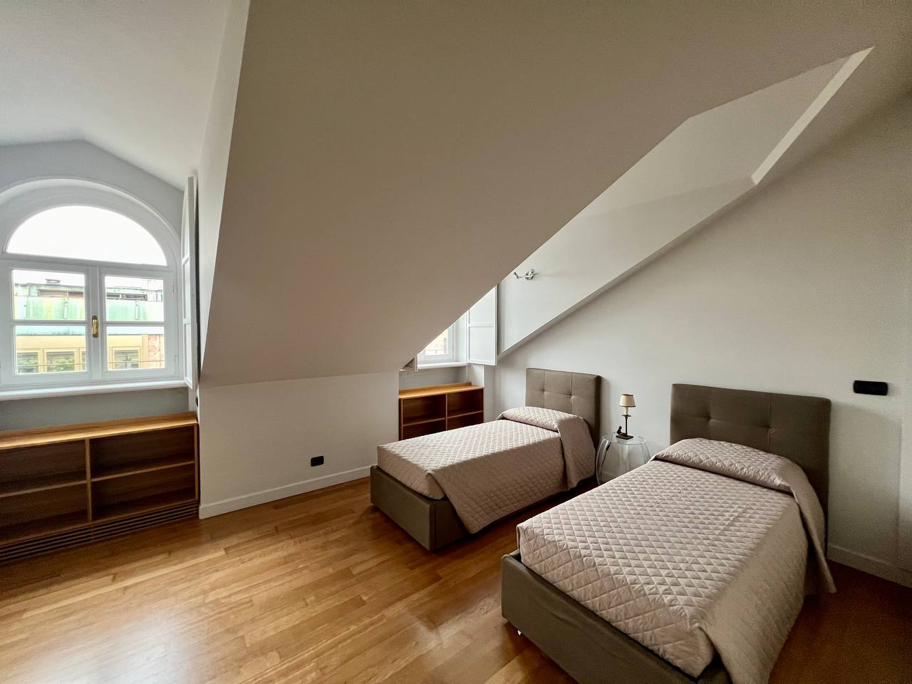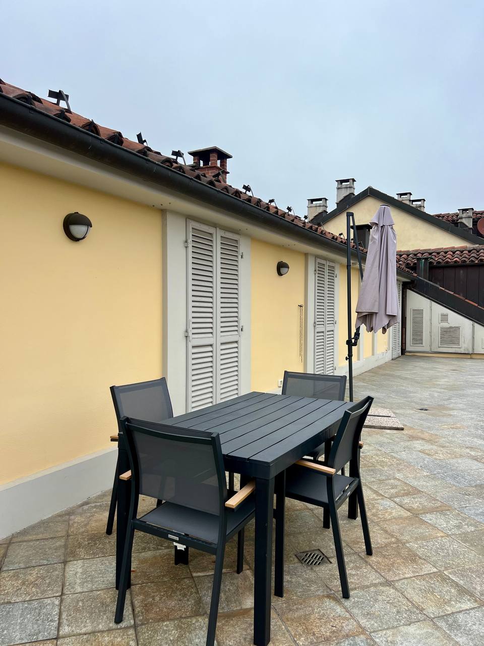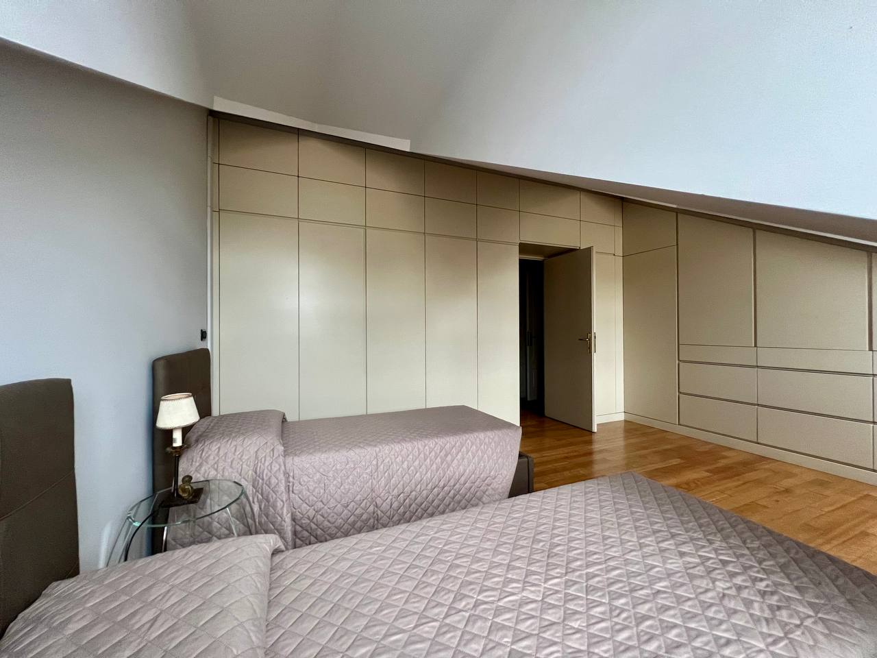 Appartamento sito all'ultimo piano di uno stabile signorile perfettamente curato nelle zone comuni, composto di ingresso su soggiorno living, cucina abitabile e attrezzata, due camere, due bagni e cabina armadio, oltre ad ampia terrazza che si affaccia sul tranquillo cortile interno. L'alloggio si trova all'ultimo piano mansardato ed è raggiungibile tramite ascensore e una breve rampa di scale da fare a piedi. L'alloggio viene affittato arredato e dispone di numerose armadiature a muro, sia nelle camere che nei disimpegni. Aria condizionata e riscaldamento autonomo. Doppia esposizione est-ovest e piano alto rendono l'alloggio particolarmente luminoso. Servizio di portineria intera giornata. Zona centralissima. Canone mensile pari a 3.000,00 euro + 180,00 euro al mese di spese condominiali. Disponibilità di due box auto singoli nello stabile aggiungendo 200,00 euro al mese per ciascuno.