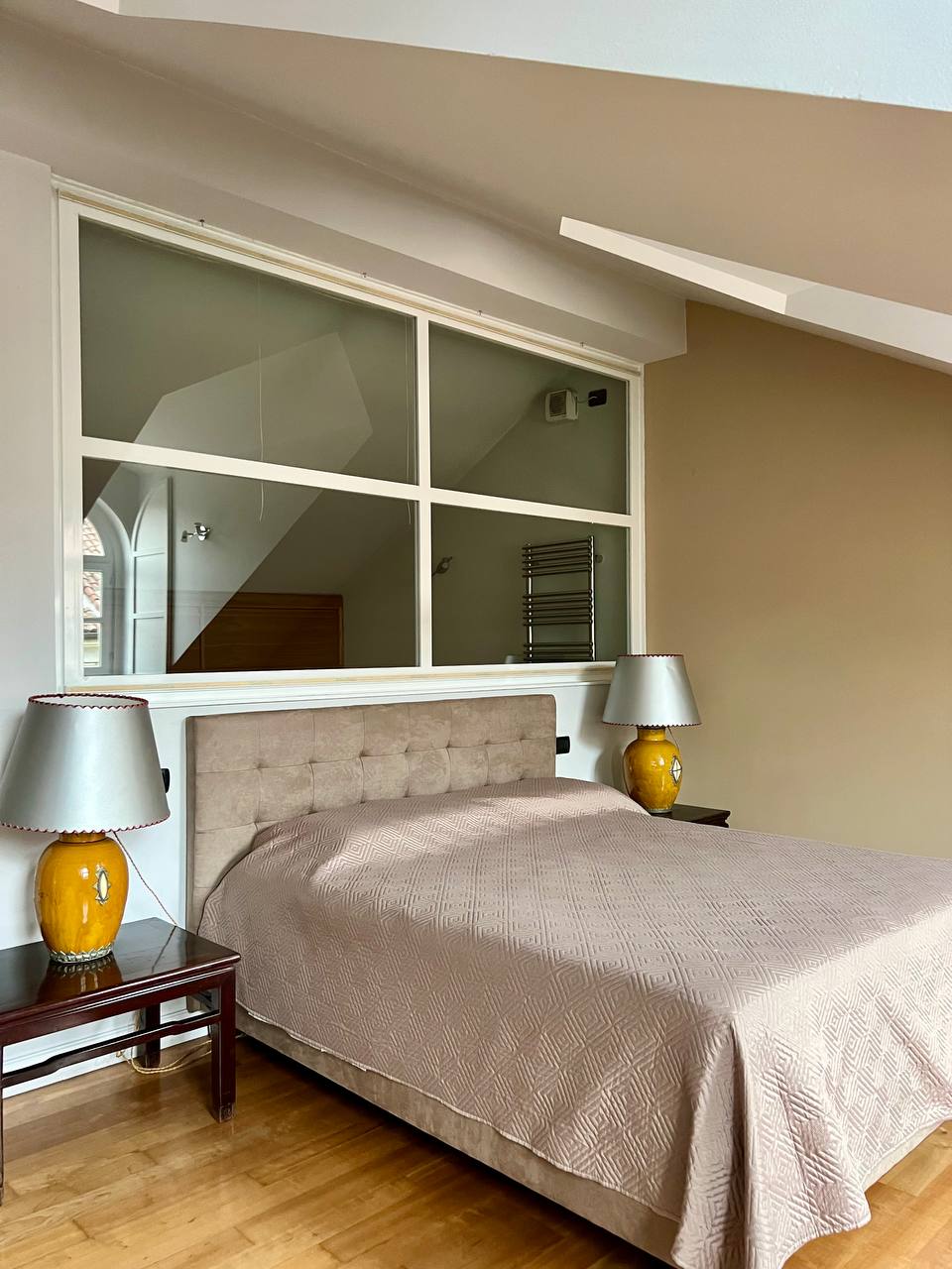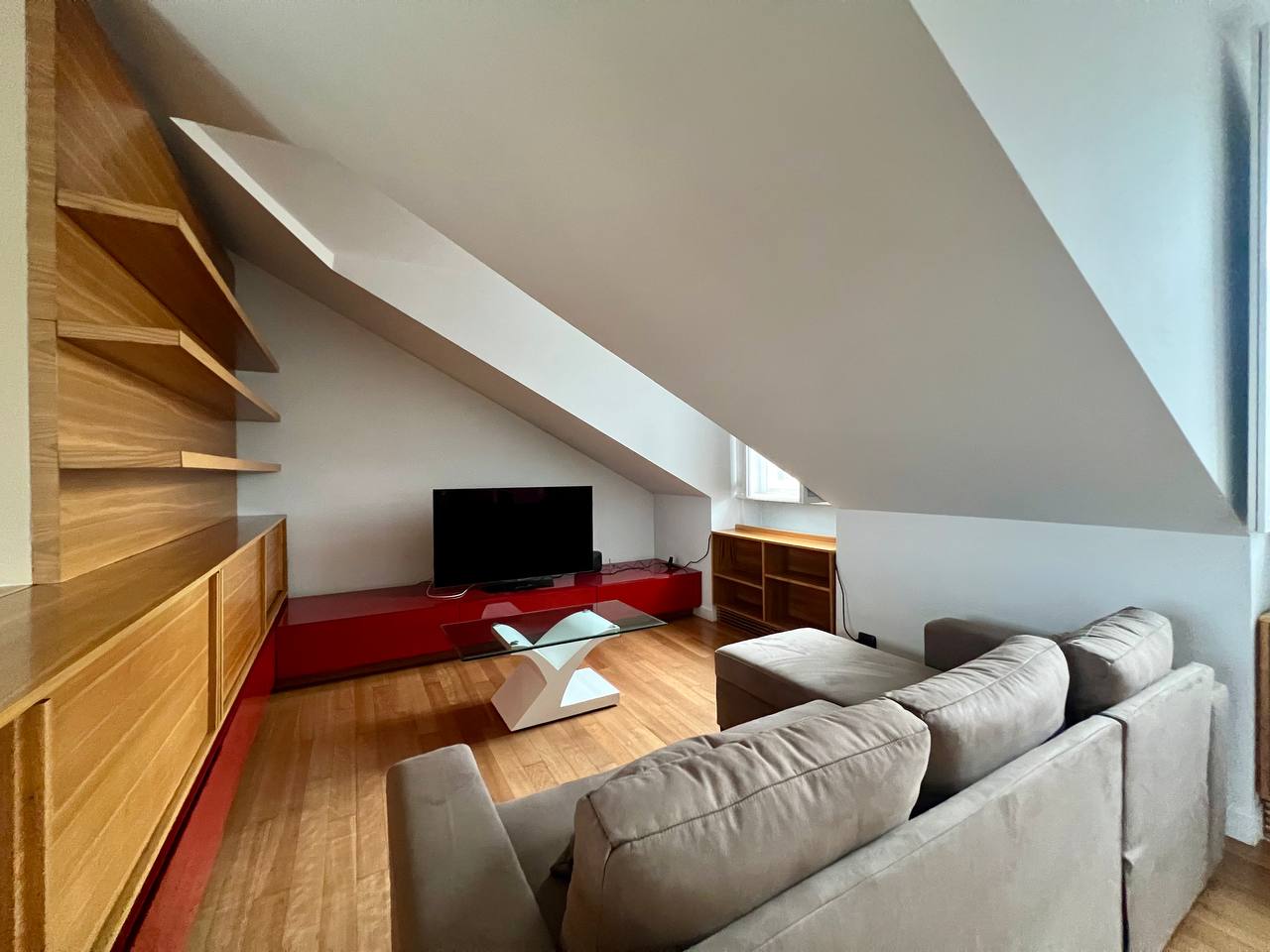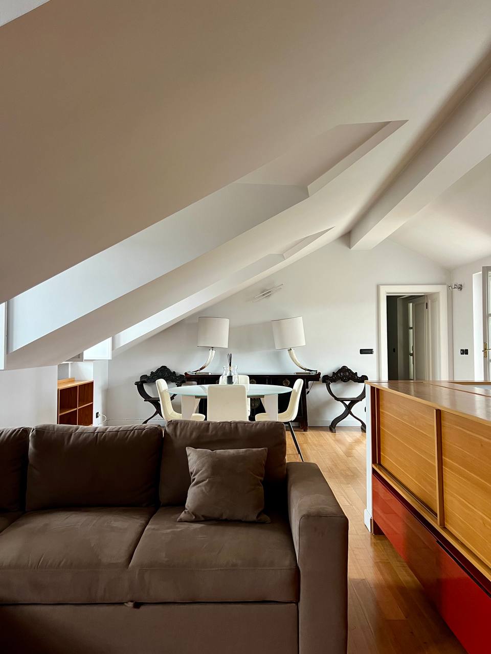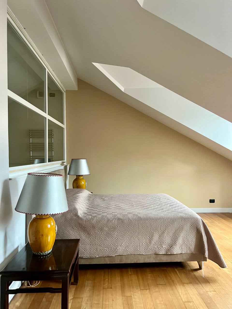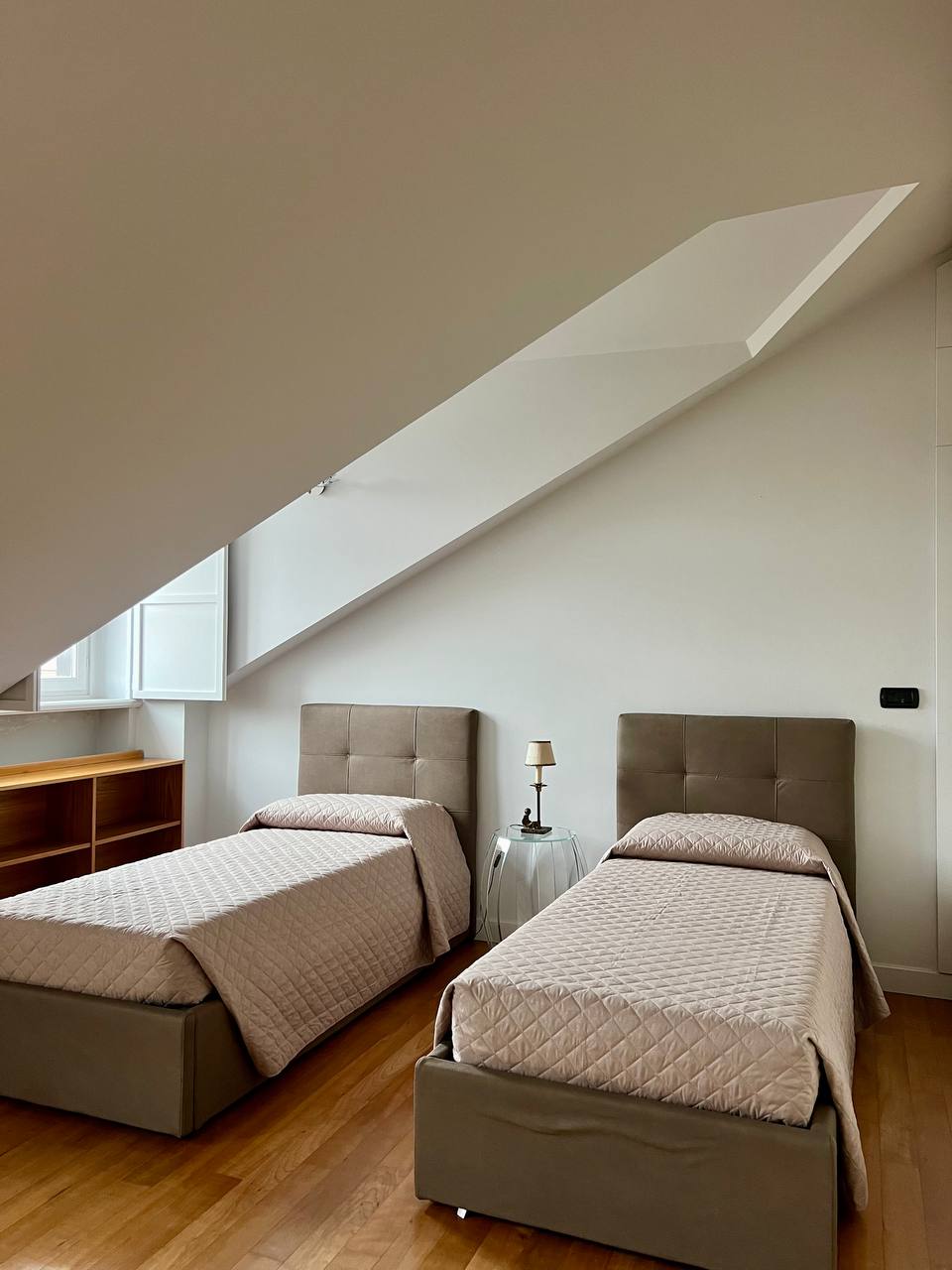 Appartamento sito all'ultimo piano di uno stabile signorile perfettamente curato nelle zone comuni, composto di ingresso su soggiorno living, cucina abitabile e attrezzata, due camere, due bagni e cabina armadio, oltre ad ampia terrazza che si affaccia sul tranquillo cortile interno. L'alloggio si trova all'ultimo piano mansardato ed è raggiungibile tramite ascensore e una breve rampa di scale da fare a piedi. L'alloggio viene affittato arredato e dispone di numerose armadiature a muro, sia nelle camere che nei disimpegni. Aria condizionata e riscaldamento autonomo. Doppia esposizione est-ovest e piano alto rendono l'alloggio particolarmente luminoso. Servizio di portineria intera giornata. Zona centralissima. Canone mensile pari a 3.000,00 euro + 180,00 euro al mese di spese condominiali. Disponibilità di due box auto singoli nello stabile aggiungendo 200,00 euro al mese per ciascuno.