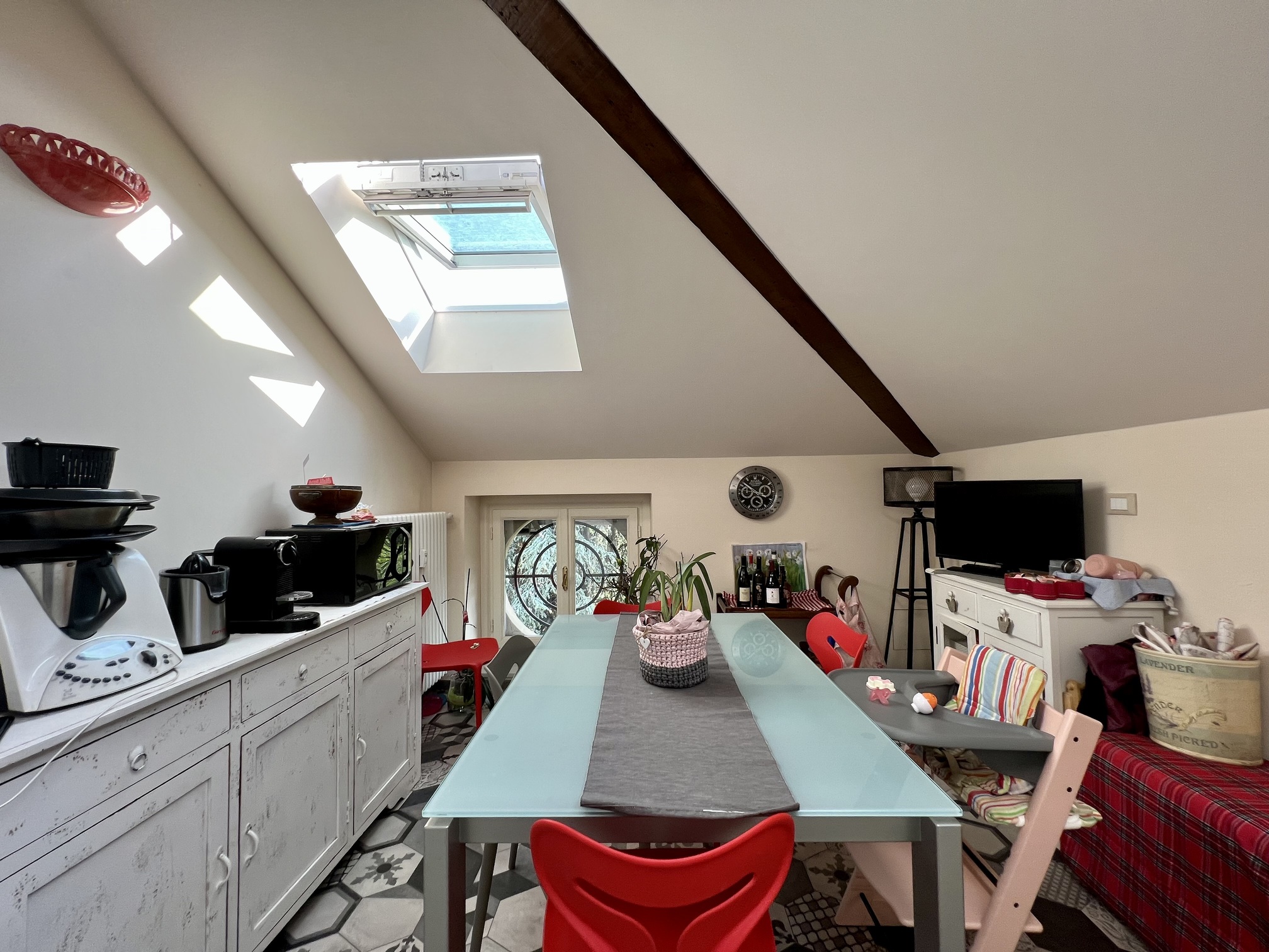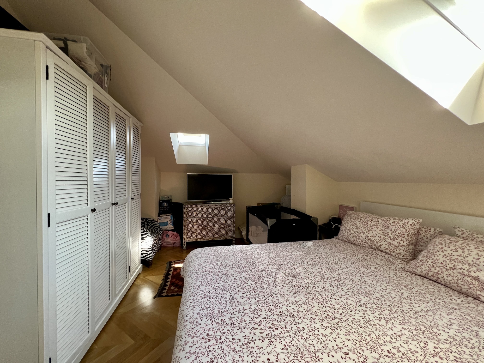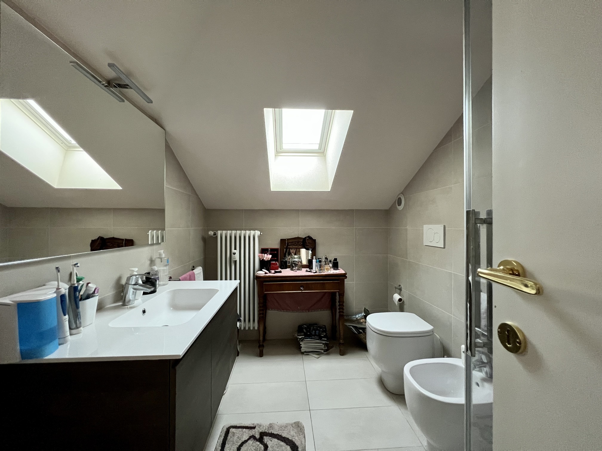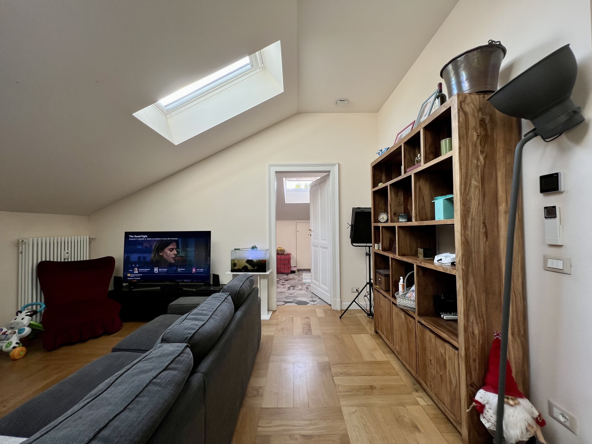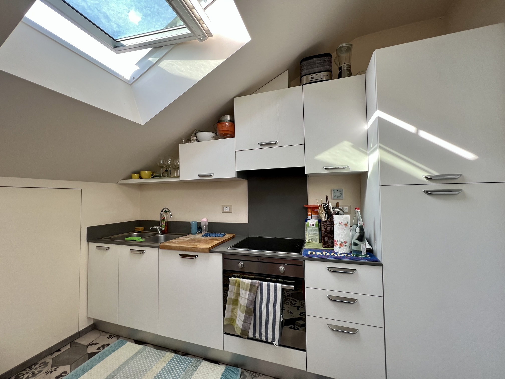 L’alloggio si sviluppa su due livelli. Al primo livello si accede tramite ingresso che conduce al soggiorno, alla cucina arredata, a una camera da letto con bagno interno e a un ulteriore bagno adibito a lavanderia. Il secondo livello ospita una camera da letto mansardata, un disimpegno con armadi a muro e un bagno completo. Completa la proprietà un locale deposito sottotetto accessibile dalla cucina.