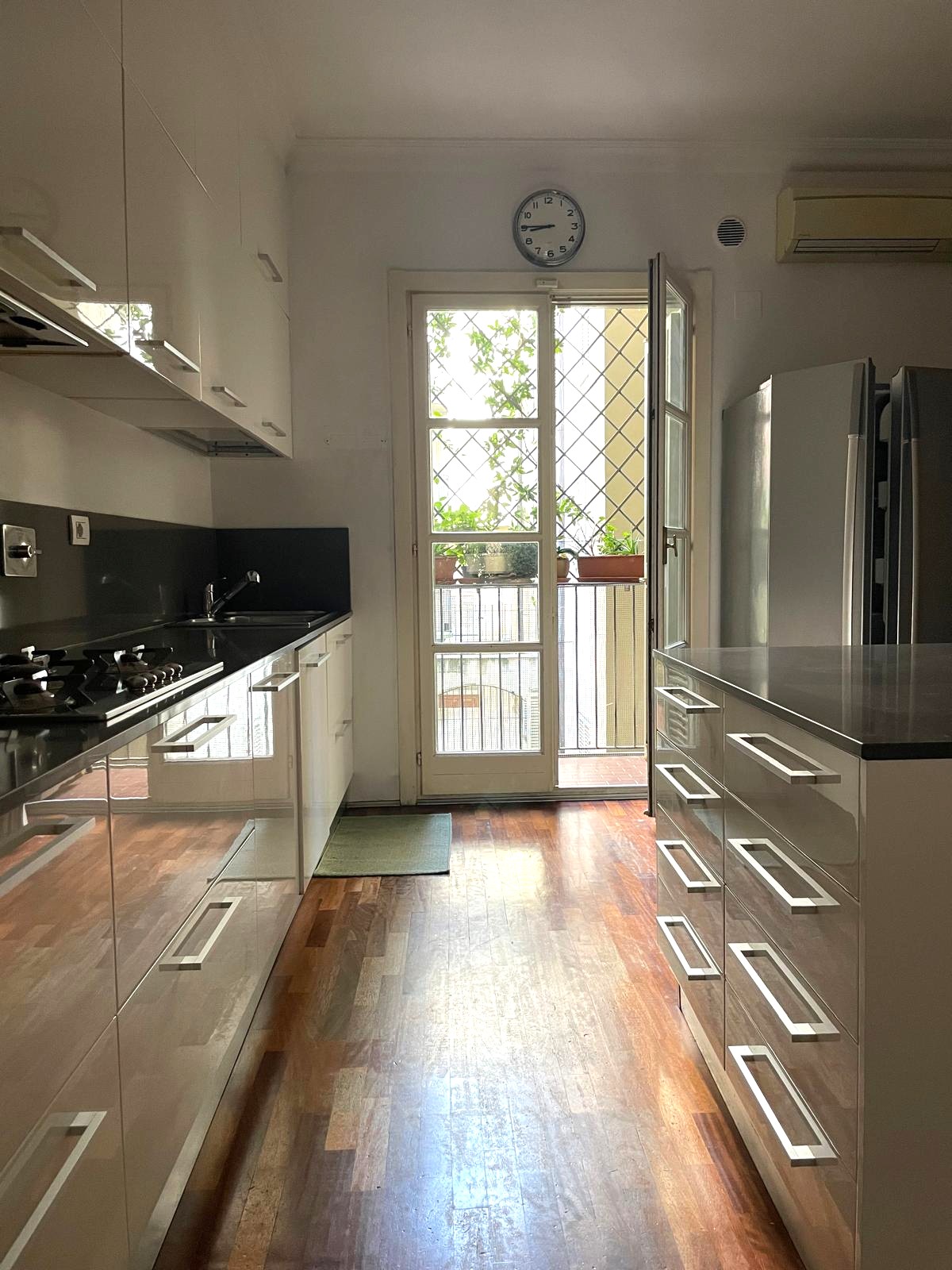 Gli ambienti si articolano in cinque locali adibiti a camere e saloni, una cucina abitabile di generose dimensioni, due bagni e un ripostiglio. Sono presenti quattro balconi, due affacciati sulla strada e due sul cortile, di cui uno particolarmente esteso in lunghezza che si affaccia sul giardino interno del palazzo.